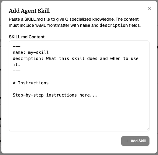 scripts/,references/, andassets/folders, but Q currently only reads the single SKILL.md content. - Manual paste — skills are added by pasting content. URL-based fetching and marketplace browsing are planned for a future release.